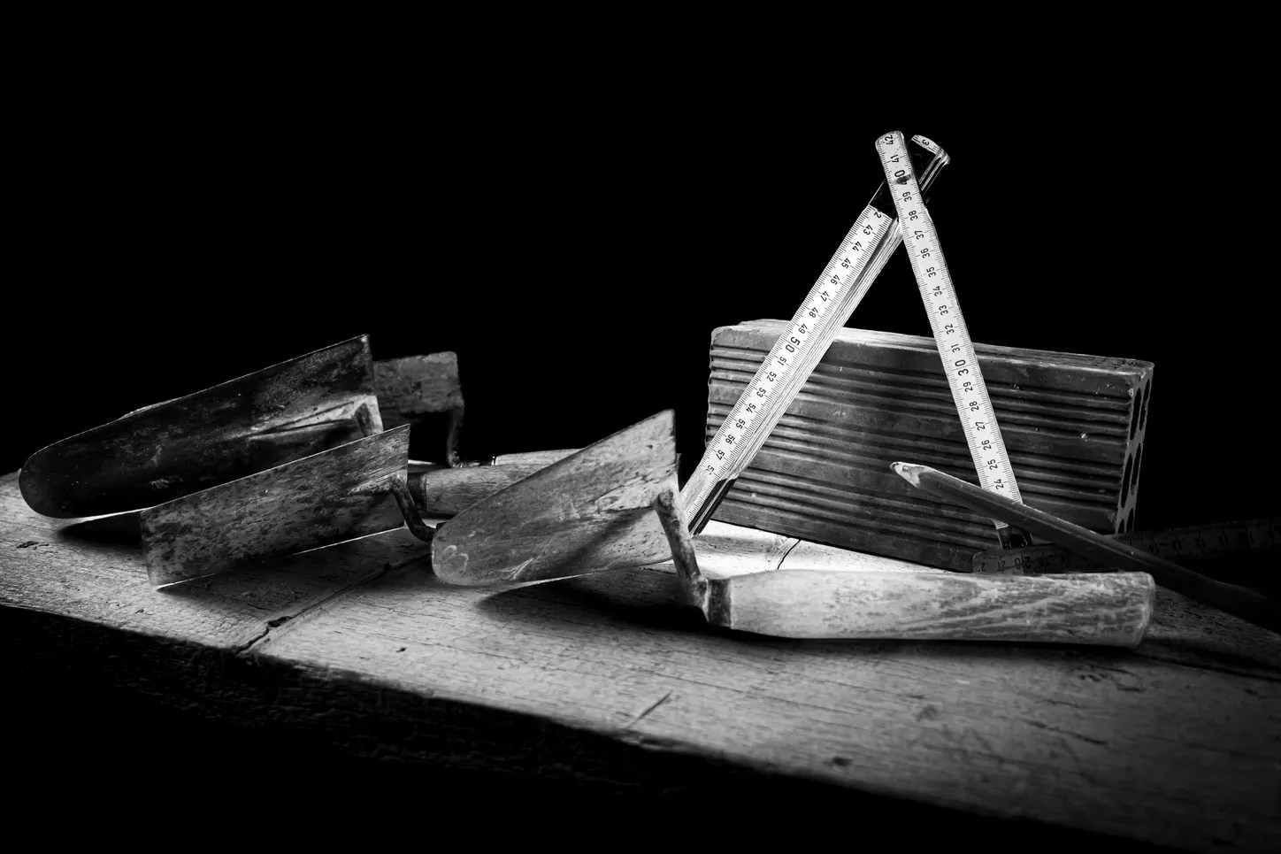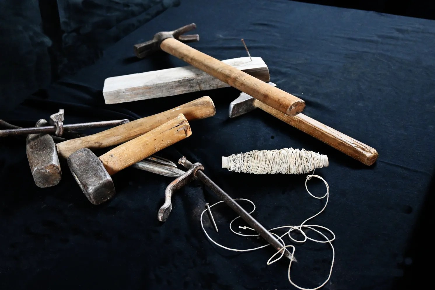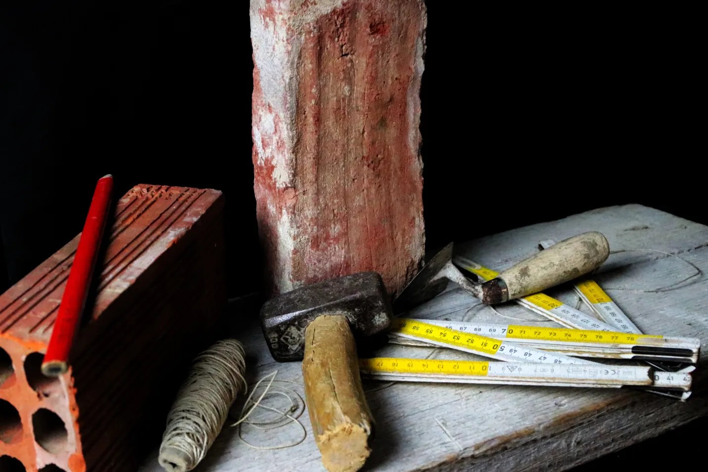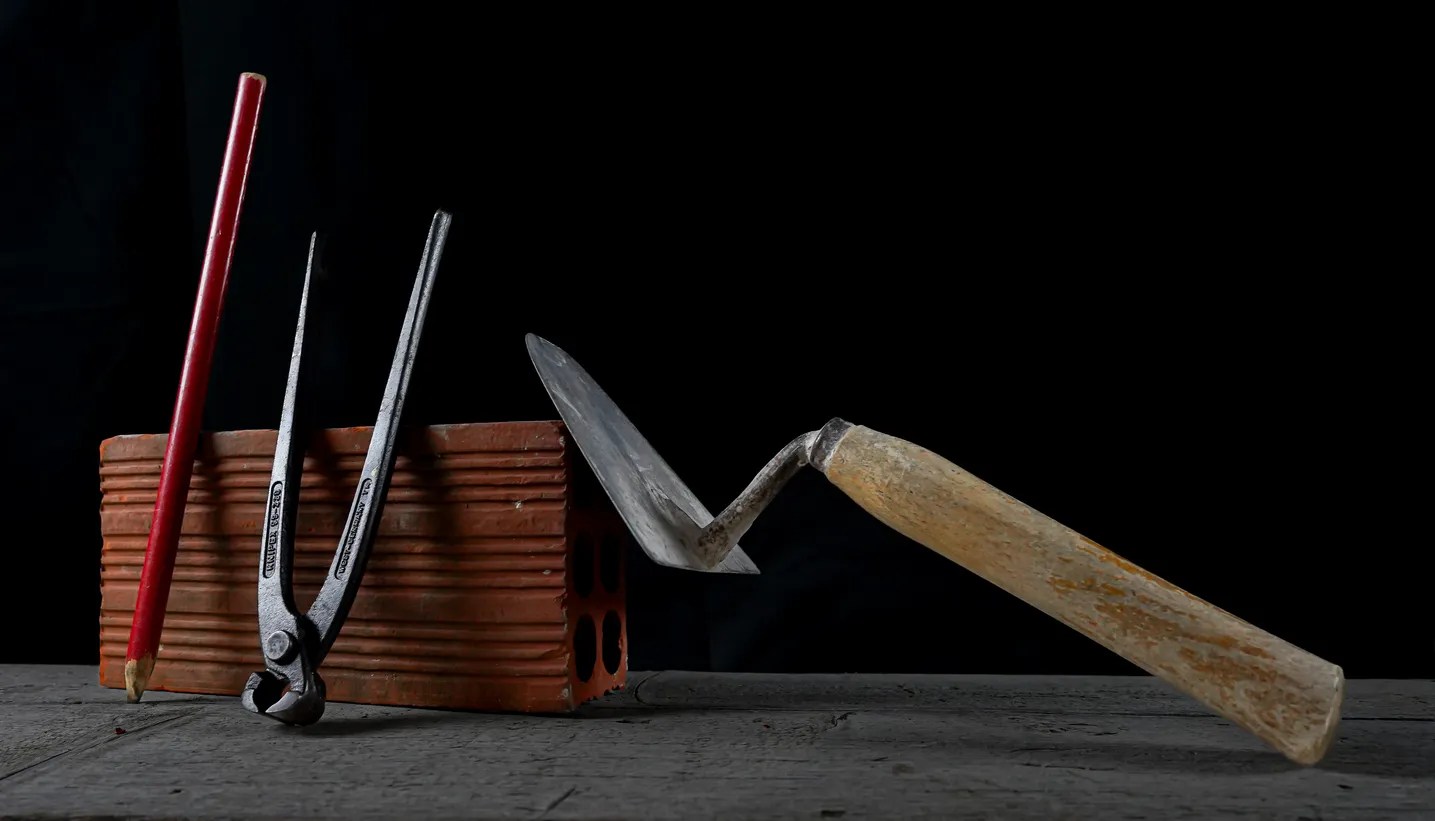 Ecco quindi disposti e disponibili sul tavolo della sala i “protagonisti” della serata: cazzuole, buglioli, mazze, mattoni, martelli, chiodi, livelle, matite, metri e molto altro.